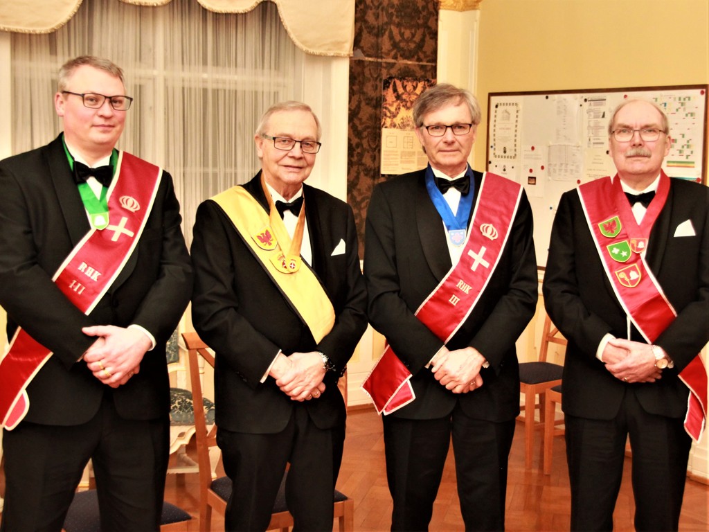 Losje IX hadde den glede å få besøk av nr. 2 fra venstre Aktverdige Storseglbevarer Broder Fred Edgar Thobiassen som utførte det Rituelle under Installasjonen. Han hadde med seg fra venstre Drott i Losje III Kongsberg Broder Christian Follstad og til høyre Seglbevarer i PLO Viken Thore Storm Ørebech som Forettende Stormarskalker. Høye Drott Broder Stein Gusdal takket for en stilfull og fin Installasjon av Råd og Hird i Losje IX Tønsberg.